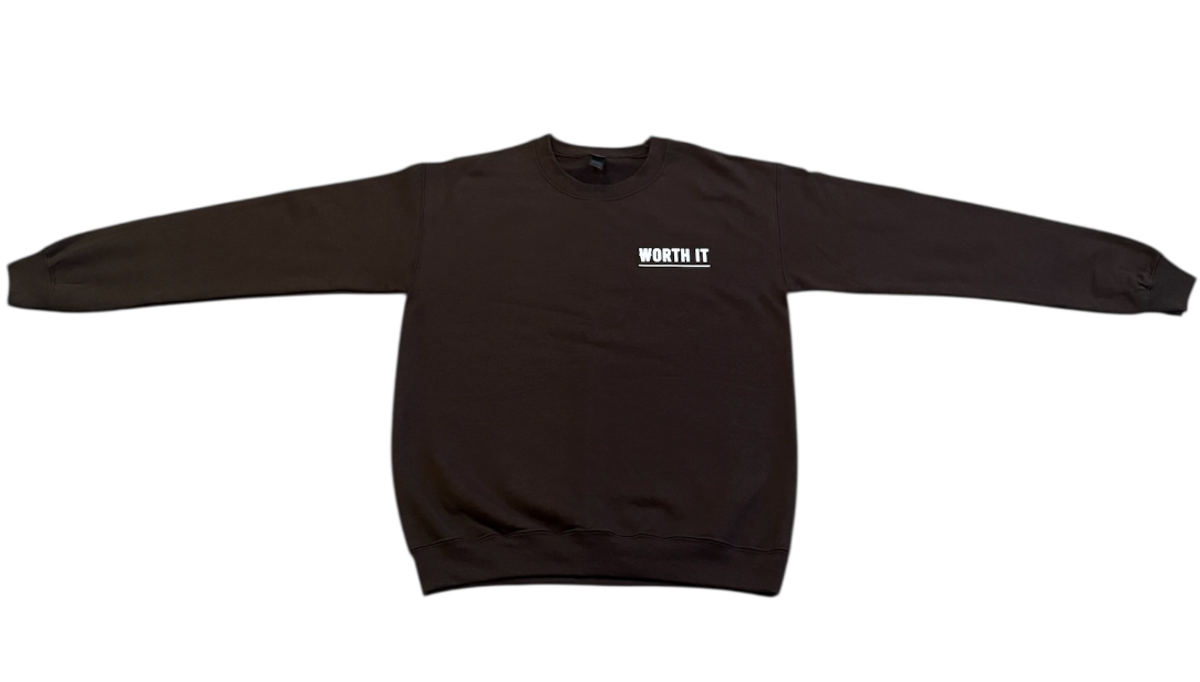 The Chocolate Brown Crewneck features a subtle, underlined WORTH IT placed on the left chest a quiet reminder you carry with you. Designed to be worn effortlessly, styled with anything, and rooted in belief.